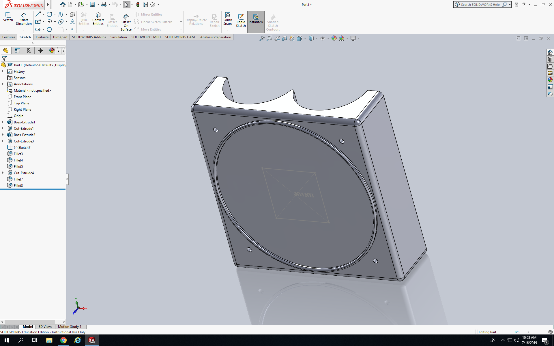 Today we created the housing parts and were introduced to the Hole Wizard feature. Explain how the Hole Wizard process works and explain the advantages of using the Hole Wizard feature over the Extruded Cut process. Today I had to create a model called the Sample Helipad. First I created a square that had dimensions of 7.25in, after that I put two circle on the side of the model and I extrude cut it all the way through as shown below. Next I sketch two circle on the front face of the square, the dimensions of one circle is 6.5in and the other one was 6.75in and I extrude cut the 6.5 circle down .125in. Next I sketch a square on the font face of the circle so I can put my name inside of the square, after that I sketch a circle next to the cancer of the first square I created. I smart dimension the circle from the the center to be 2.687in, after I clicked circular pattern and made 3 more circles. Last I fillet all the sides on the front face and the corners to .2in.