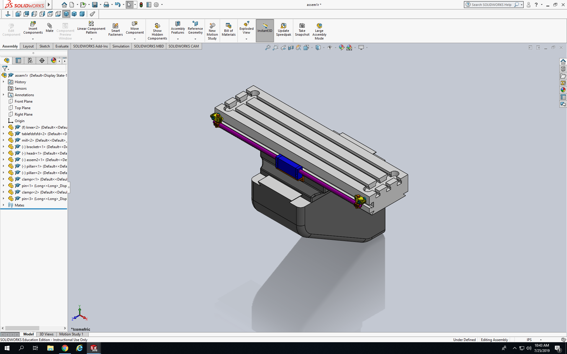 Today we completed the Mill project, to create Mill I need to assemble all different the different parts that are already created. First I put the part called the knee, the table, and another part. Next I mate the the knee with the part called the saddle and the saddle with the table. After that I added more parts the call the scald, head, and bracket, I mate the bracket on the side of the table and I mate the head on top of the bracket after that I mate the scale in side the hole of the head. Next I add parts called pillar, clamp, and pin so first I mate the pin in a hole on the side of the table after I did that I mate the pillar and the clamp together and mate those to the pin so that the scale fit in the hole After I repeat the same thing on the other hold on the left side of the table.