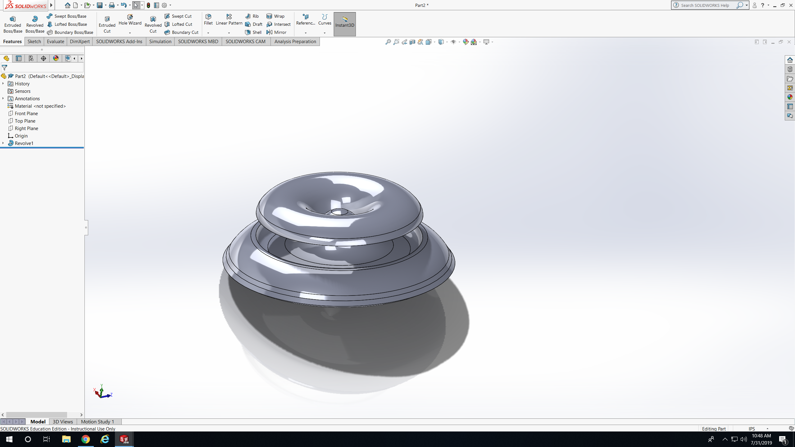 Today we where introduced on a power point many and different type of 3D printing and how they print and also what they use to print. We where introduce to FDM, SLA, SLS, EBM, SLM, and what they mean or what type of materials they use. After we were introduced to the different types of printing we had to create anything we want and we can search how to create it on the internet. First I was planning to make a model car but it was too much steps on to make it and it world take a long time, so than I wanted to create a air plane, first I wanted to create a prototype plane so I created the base the base only took a few steps but I couldn’t figure out how to create the fins, but it was too complicated so I decided to make a boat like vehicle. First I sketched the model than I pressed Revolved boss/bass and than I got what I did below and I looked like a UFO so I named it a UFO. It doesn’t look like how I imagined it to be but I like how this looks so I kept it.